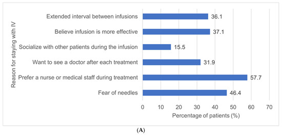 Of the 97 (54.5%) who preferred to continue with IV infusion, the most common reason was the presence of a nurse or medical staff during treatment (57.7%). The next most common reasons included a fear of needles, the belief that infusion is more effective, the extended intervals between infusions, and a desire to see a doctor after each infusion session. Figure 3 delineates the specific motivations behind patients’ preferences for either staying with IV treatment (Figure 3A) or opting for a switch to SC treatment (Figure 3B).