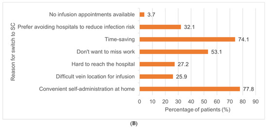 Reported reasons for preferring remaining on IV administration (A) and switching from IV to SC (B).
