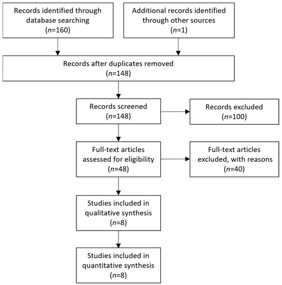 The initial literature search of the online archives resulted in a collective number of 160 articles, while one more was revealed through the search for grey literature. Following the removal of duplicates, the number of articles was brought down to 148. Afterward, the identified studies were screened according to their title and abstract, ultimately resulting in 48 articles eligible for full-text analysis. The remaining articles were not included because they investigated different research questions to the one of our study, or on the grounds of including non-adult patients, or because the required data were not extractable. Following the full-text analysis, eight studies in total [12,13,14,15,16,17,18,19] were eligible for inclusion in the qualitative and quantitative analysis. The selection process of the included articles can be found in Figure 1.
