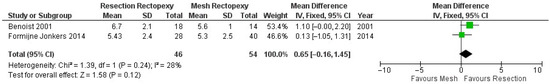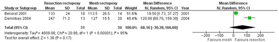 Forest plot of the analysis of the length of stay of the compared procedures [13,18].