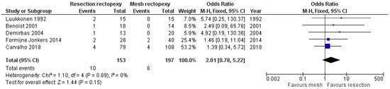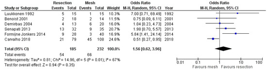 Regarding the overall complication rate, six studies provided data [10,11,12,13,16,17], and the meta-analysis showed that the two methods did not differ significantly (OR 1.56, 95% CI 0.62 to 3.96). This finding is demonstrated in Figure 4. The sensitivity analysis of this random effects model meta-analysis with I2 = 50% and I2 = 25% confirmed the above findings (logOR −0.37, 95% CI −1.13 to 0.38, p = 0.334 and logOR −0.23, CI 95% −0.83 to 0.35, p = 0.433, respectively). Also, a statistical analysis of the rate of surgical site infections that was mentioned in three studies showed that the two methods under study had similar outcomes (OR 1.39, 95% CI 0.37 to 5.23). This outcome is shown In Figure 5. Furthermore, the comparison of the cardiopulmonary complication rate that was mentioned in five studies showed that the two methods under investigation did not differ significantly (OR 2.01, 95% CI 0.78 to 5.22). This outcome is shown in Figure 6. Moreover, only one case of death was reported by Luukkonen et al. in the resection group on the second postoperative day due to myocardial infarction.