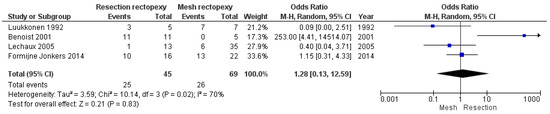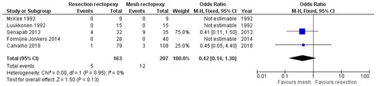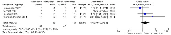 Regarding the long-term post-operative outcomes, there are comparable outcomes in the rate of constipation improvement between the two methods (OR 12.59, 95% CI 0.13 to 12.59). This outcome is shown in Figure 7. As this meta-analysis was carried out with an random effects model due to the large heterogeneity, we conducted a further sensitivity analysis with I2 = 50% and I2 = 25%, which confirmed our findings (logOR −0.123, CI 95% −0.186 to 1.61 p = 0.889 and logOR −0.04, CI 95% −1.38 to 1.30, p = 0.953). Moreover, the two techniques had comparable outcomes in the rate of incontinence improvement (OR 1.60, 95% CI 0.65 to 3.91). This outcome is shown in Figure 8. Finally, no statistically significant difference between the two methods was identified when comparing the recurrence rate (OR 0.42, 95% CI 0.14 to 1.30). This comparison is demonstrated in Figure 9.