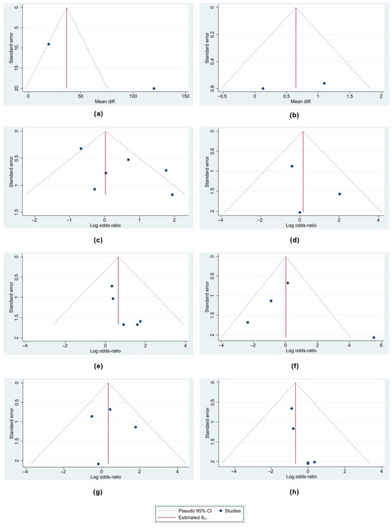 Funnel plots of the analyses performed indicating that there was no publication bias among the selected studies. (a) Funnel plot of comparison of operative time, (b) funnel plot of comparison of length of stay, (c) funnel plot of comparison of overall complication rate, (d) funnel plot of comparison of surgical site infection rate, (e) funnel plot of comparison of cardiopulmonary complication rate, (f) funnel plot of comparison of constipation improvement rate, (g) funnel plot of comparison of incontinence improvement rate, and (h) funnel plot of comparison of recurrence rate.
