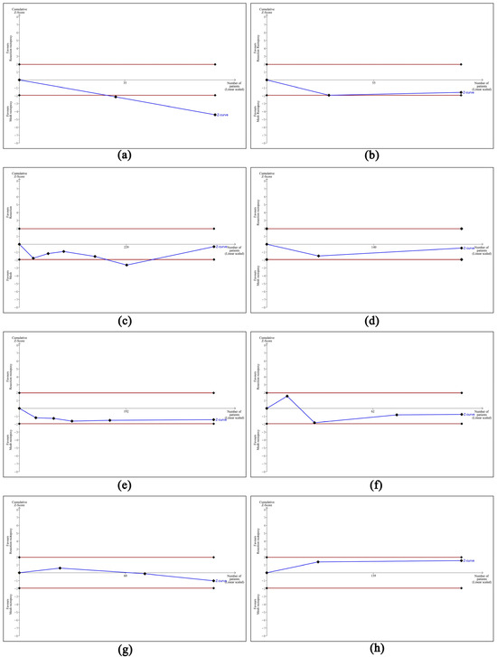 Outcomes of trial sequential analysis showing that the number of the included studies was sufficient to draw definite conclusions only for the first meta-analysis. (a) TSA of meta-analysis of operative time, (b) TSA of meta-analysis of length of stay, (c) TSA of meta-analysis of overall complication rate, (d) TSA of meta-analysis of surgical site infection rate, (e) TSA of meta-analysis of cardiopulmonary complication rate, (f) TSA of meta-analysis of constipation improvement rate, (g) TSA of meta-analysis of incontinence improvement rate, and (h) TSA of meta-analysis of recurrence rate.