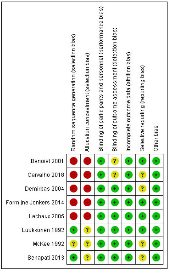 Finally, the outcome of the assessment of potential bias in the included studies in this systematic review and meta-analysis is shown in Figure 12 and Figure 13. According to this assessment, there is a significant risk of selection bias due to inadequate randomization and inadequate concealment prior to the intervention. This could have potentially affected the outcomes as the interventions were either based on availability, the surgeon’s preference, or on the patient’s specific symptoms as part of an individualized approach. Nonetheless, despite the lack of blindness, there is a low risk of performance and detection bias as the outcomes were judged using various valid scoring systems of post-operative performance or they were assessed using investigations such as anal manometry. Finally, there is a low risk of attrition, and as there were no missing outcome data, the risk of reporting bias is low to unclear as half of the included studies did not report all of the outcomes that were of interest in our systematic review and meta-analysis.
