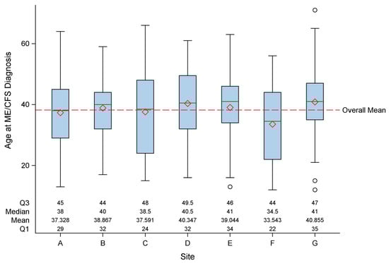 We initiated this study to characterize patients with ME/CFS based on the clinical opinion of clinicians with recognized expertise in diagnosing and caring for these patients. The goal of this analysis was to determine if differences in clinical practice resulted in different subgroups of patients. We used standardized instruments to measure the major domains of illness experienced by patients with ME/CFS and evaluated these characteristics for patients seen at each clinic and overall. The specialty clinics differed in size (solo practice, small group, academic, hospital-based), location (metropolitan, urban, and rural), and practice characteristics (time spent with patients, charges for initial visit, follow-up visits). The board certifications of the physicians included internal medicine, environmental medicine, infectious diseases, immunology, hematology, neurology, and pediatrics. Certifications could influence referral patterns and approaches to laboratory testing, diagnosis, and management. There were statistical differences between sites in the general characteristics of their patients. Socio-demographic variables (Table 2) showed statistical differences by clinic site, but the distributions of the variables overlapped (such as age at enrollment, Figure 1) and were in the same direction (predominately insured white women with a high level of education). Similarly, there were statistical differences by site in the age at diagnosis, mode of onset, duration of fatigue, and BMI. Again, distributions were overlapping (such as age at diagnosis, Figure 2) and in the same direction (majority of patients had sudden onset and were overweight). Interestingly, the largest variation was in the number of medications prescribed for patients, with a mean ranging from 4.1 to 8.2 (p = 0.001).