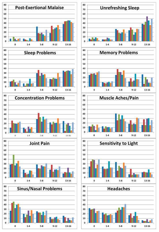 As noted above, the standard deviations of the measures of illness indicate the heterogeneity of these measures. Histograms of the CDC Symptom Inventory scores (Figure 4) illustrate how score distributions differ by symptom, with each clinic’s scores following the same pattern. Symptoms included in most case definitions (post-exertional malaise and sleep) have greater frequency in the higher symptom score groups. By comparison, the score distributions of memory and concentration, muscle aches/pain, joint pain, sensitivity to light, and sinus/nasal problems are more evenly spread over the score groups. Other symptoms, such as fever, chills, and depression, are heavily represented in the lower score groups. The DSQ scores follow the same pattern.