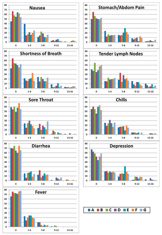 Histograms of CDC Inventory Scores by clinic. Frequency of CDC Symptom Inventory scores (frequency X severity) is shown by score groups 0 (not present), 1–4, 5–8, 9–12, and 13–16 (highest scores) for each clinic (A–G, shown by colors noted at the bottom of the figure).