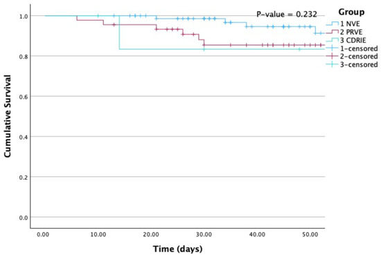 Kaplan-Meier curves for all-cause mortality according to group. NVE, native valve infective endocarditis; PRVE, prosthetic + repaired valve infective endocarditis; CDRIE, cardiac device-related infective endocarditis. P (Log Rank) = 0.232.