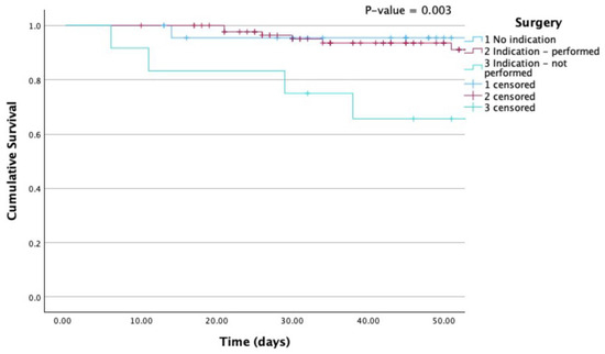 Kaplan-Meier curves for all-cause mortality according to surgery. Mortality was particularly elevated when surgery was indicated but not performed. P (Log Rank) 0.003.