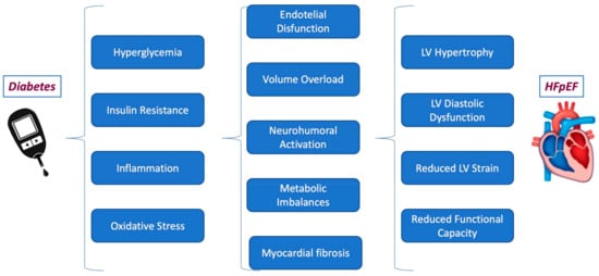 Although still not fully understood, several pathophysiological mechanisms, such as volume overload due to impaired natriuresis, neurohumoral activation, and metabolic imbalances, have been hypothesized to contribute to the poorer prognosis of patients with DM and HFpEF [47] (Figure 1).