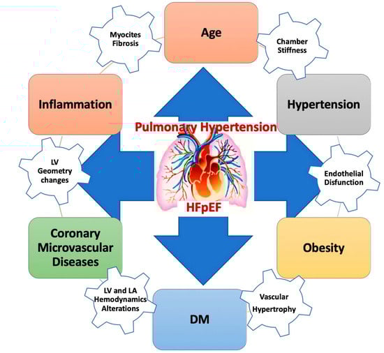 In addition, reactive elevation in pulmonary arterial tone or intrinsic arterial remodeling leads to an additional pre-capillary PH. PH is known to be an important contributor to morbidity and mortality in patients with HFpEF [57] (Figure 3).