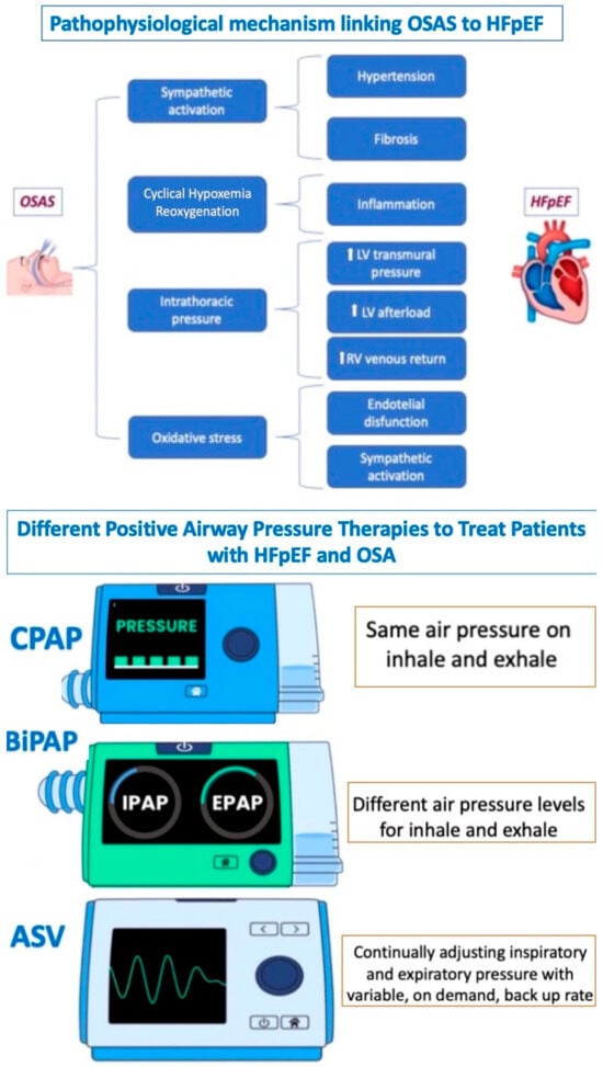 Recent studies support positive airway pressure (e.g., CPAP, bi-PAP, or ASV) as an effective method to treat patients with HFpEF and OSA, particularly in reducing symptoms and improving functional status [70,71,72] (Figure 4).