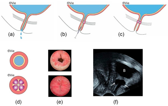 Bulking agents injection: (a) Stress urinary incontinence; (b) Transurethral injection of bulking agents; (c) Continence after bulking agents injection; (d,e) Top: open urethra (funneling), incontinence; bottom: coaptation after injection of four depots of bulking agents, continence; (e) Urethroscopy before and after Bulkamid® injection; (f) Pelvic floor sonography, sagittal view: Bulkamid® depots (white arrows) are visible. B: bladder.
