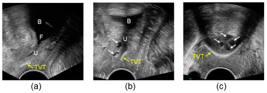 Pelvic floor sonography: Combined effect of bulking agent (Bulkamid®) and a sling. (a) Recurrence after TVT insertion, situation before Bulkamid® injection. In the sagittal view, funneling is visible at straining, the position of the TVT is too distal; (b) Continence after subsequent Bulkamid® insertion. At straining, the Bulkamid® depot is pressed towards the TVT. Together, they achieve urethral continence; (c) Axial view, same patient: the four Bulkamid® depots are localized in one plane around the urethra to render continence. Due to coaptation, the urethral lumen itself is closed while funneling is no longer present. B: bladder; F: funneling; U: urethra; white arrows point to Bulkamid® depots; yellow arrows point to TVT.
