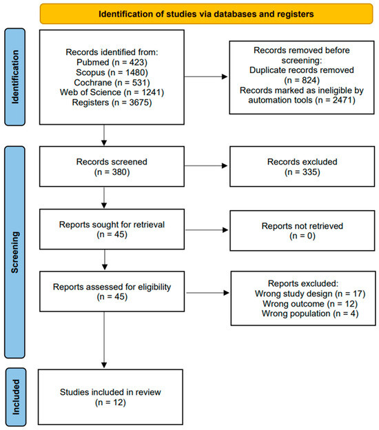The initial search across different databases yielded a total of 3675 articles. Subsequently, in the same databases, the search was refined by document type (article and randomized clinical trial), year of publication (last 10 years), and participant age (Middle Age: 45–64 years, Advanced Age: >65 years, Middle Age + Advanced Age: >45 years), followed by the removal of duplicate articles. This process resulted in 380 unique articles. The 380 articles underwent title and abstract evaluation, and 45 articles emerged as candidates for qualitative evaluation. Ultimately, 12 final articles [35,36,37,38,39,40,41,42,43,44,45,46] were selected for the meta-analysis, as they met the inclusion criteria, while 33 articles were excluded (see Figure 1).