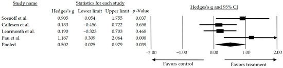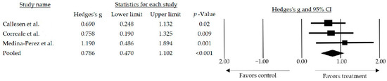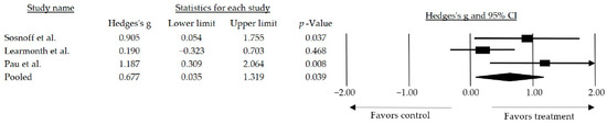 Furthermore, a meta-analysis was conducted including the studies where the control group received no treatment or was on the waiting list [39,40,42]. The randomized model was employed for this meta-analysis (I2 = 19%, Q-Value = 6.983 with 2 degrees of freedom, and p = 0.030). However, the observed mean effect was small and lacked statistical significance (g = 0.505, 95% CI: −0.146–1.156; p = 0.128).