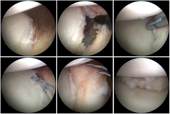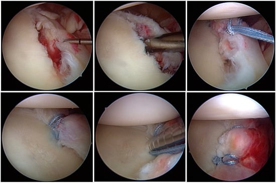 2.1.2. KA Group: Suture-First Technique Using Knotless Suture Anchors—Pushlock (Arthrex, Naples, FL, USA)