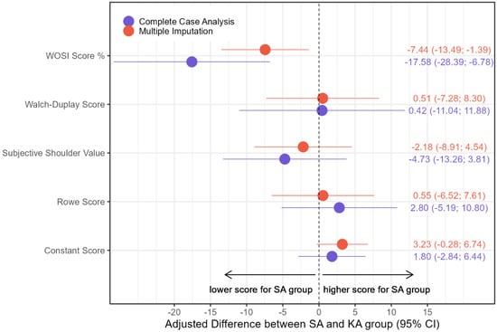 Based on mixed effects linear regression models, the WOSI score and the Constant Score differed relevantly between the two treatment groups over all follow-up time points. Based on these models, patients treated with SA are estimated to have a 7.4%-points lower WOSI score (−7.44, 95% CI: −13.49, −1.39), and a 3.2 higher Constant Score (3.23, 95% CI: −0.28, 6.74), based on multiple imputation, in the ITT population. The differences between the groups are irrelevant for the Walch–Duplay Score and not clear for the SSV and Rowe score, where wide confidence intervals indicate great uncertainty in the effect estimation (Figure 3).