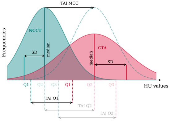 A representation of the thrombus characteristics that are calculated from the histogram of Hounsfield Unit (HU) intensity values of the thrombus in NCCT (green) and CTA (red). Three TAI (Thrombus Attenuation Increase) values are calculated from the difference between the first, second, and third quartiles (Q1, Q2, and Q3) of the two histograms. TAIMCC (maximum cross correlation) is a measure of how much the NCCT histogram should be moved to achieve the maximum cross correlation with the CTA histogram. The distribution showed with a green, dashed line is the shifted NCCT histogram. Heterogeneity is defined as the CTA and NCCT SD (Standard Deviation). Density is shown as the CTA and NCCT median. In this figure, we have assumed the two histograms are normal distributions. In case of a non-normal distribution, median values do not overlap with the second quartile, and TAIMCC is not necessarily the exact distance between the two medians.
