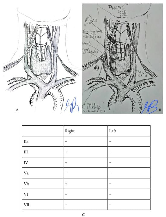All recruited subjects had undergone, the day before surgery, a high-resolution US examination of the neck (preoperative mapping) performed by an endocrinologist for the evaluation of US features of suspected thyroid nodules and targeted the evaluation of neck LN and their characteristics. A second endocrinologist, an ultrasound specialist, and the surgeon attended the procedure. The two endocrinologists reached consensus decisions to reduce inter-observer variability. During the examination, a resident surgeon drew an anatomical model of the neck on paper, marking the exact location of the suspected LN reported while mapping (Figure 1), and the reported size. Finally, the presence or absence of suspected LN was put in a summary table (Figure 1C). This graphic illustration provided the surgeon with the exact location of the suspected LN, making surgery as accurate as possible. At the end of the procedure, the clinical case was discussed among healthcare providers and the surgical plan was then communicated to the patient. Surgical procedures were performed between November 2015 and June 2023 by two senior endocrine surgeons (>100 thyroidectomies/year) (Figure 2).
