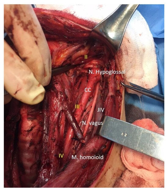 Intraoperative image with lymph node levels and key vascular-nervous structures of the neck. CC: common carotid artery. JIV: internal jugular vein. Nerve hypoglossal, Nerve vagus, Muscle homoioid. II lymph node level in the neck. III lymph node level in the neck. IV lymph node level in the neck.