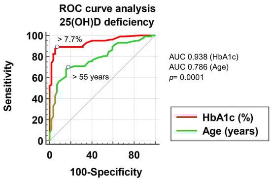 To evaluate the association of 25(OH)D deficiency with the factors included in the multivariate regression analysis, measured on a continuous scale (patient’s age and HbA1c), we built a multivariate logistic regression model, with potential predictors as of the variables mentioned above, respectively outcome, the 25(OH)D deficiency. We compared the ROC curves to evaluate the possibility of predicting a low 25(OH)D level based on the possible factors studied. According to the ROC curves, an age > 55 years and an HbA1c > 7.7% represent statistically significant predictive factors for 25(OH)D deficiency, with a sensitivity of 69.9 and specificity of 82.5 for age (AUROC 0.786, p < 0.001) and a sensitivity of 89.3 and a specificity of 92.9 for HbA1c (AUROC 0.938, p < 0.001) (Figure 2).