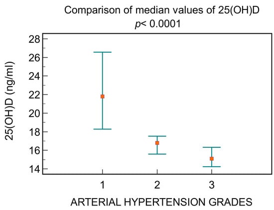 Depending on the blood pressure, a decrease in the level of 25(OH)D is observed, directly correlated with increasing hypertension grades, as follows: patients with grade 1 had a median value of 25(OH)D 21.8 ng/mL [16.7; 28.4], those with grade 2 had 16.8 ng/mL [14.3; 20.1], and those with grade 3 had 15.09 ng/mL [13.5; 17] (p < 0.0001, Figure 5).