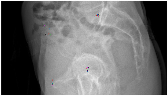 The radiographs with annotations from five annotators for a secondary assessment. Different colors indicate distinct annotators. Round dots represent annotations placed by directly clicking on the relevant location, while triangles represent annotations derived from calculating locations based on annotated bone contours.