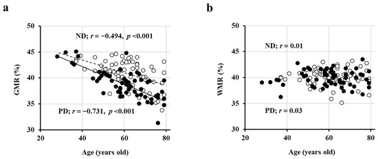 First, in a cross-sectional study involving 69 patients with ND (ages 61 ± 10 years, 37/32 males and females, eGFR 39 ± 12 mL/min/1.73 m2) and 62 PD patients (ages 60 ± 12 years, 41/21 males and females), we observed a significant negative correlation between GMR and age (Figure 1a), whereas WMR did not exhibit a correlation with age (Figure 1b) [26]. Moreover, the regression line was lower in PD patients compared to ND patients (indicating smaller GMR in PD patients at the same age), and this difference further increased with age (Figure 1a) [26].