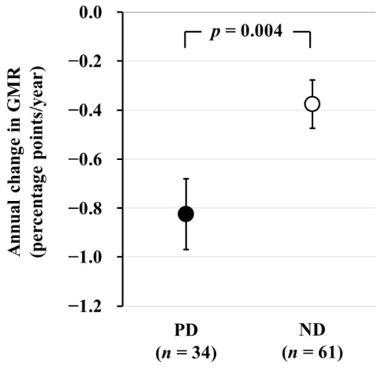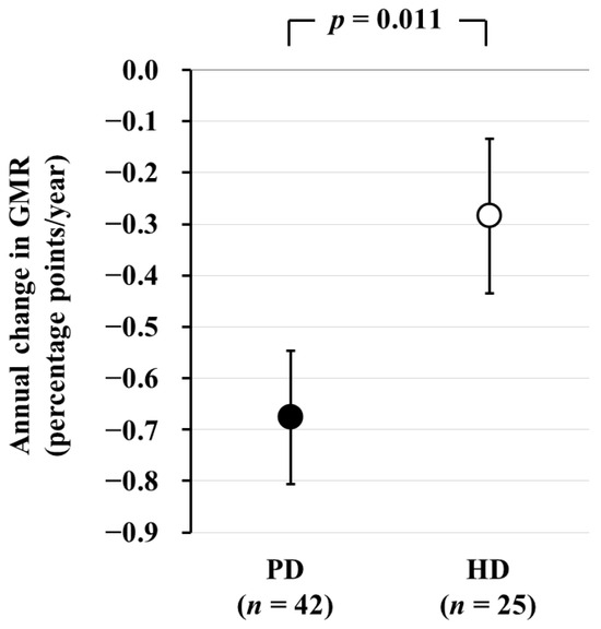 In a subsequent longitudinal study involving 61 ND patients (age 61 ± 10 years, 32/29 males and females, eGFR 39 ± 12 mL/min/1.73 m2) and 34 PD patients (age 60 ± 11 years, 21/13 males and females) who underwent brain MRI examinations after a 2-year interval, we found that the annual change in GMR (AC-GMR) was −0.38 ± 0.10 percentage-points/year in ND patients and −0.83 ± 0.14 percentage points/year in PD patients. This indicates that brain atrophy progressed more than two times faster in PD patients compared to ND patients (Figure 2) [26]. According to a report on general healthy subjects, GMR decreases with age at a rate of 0.2–0.3 percentage points/year, suggesting that brain atrophy progresses three times more rapidly in PD patients than in healthy subjects.
