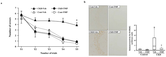 In order to elucidate the mechanism of CI in CKD, we conducted the following experiments using CKD mice created through 5/6 nephrectomy. At 8 weeks post-modeling, we performed the water maze test and evaluated the learning function of CKD mice compared to sham-operated control mice. Subsequently, we conducted pathological and immunohistological examinations using the extracted brains. In the hippocampus of CKD mice, degenerated cells with nuclear condensation (pyknotic cells) appeared along with the accumulation of 8-hydroxy-2′-deoxyguanosine (8-OHdG). The learning ability of CKD mice was significantly decreased in the water maze test. Conversely, in CKD mice administered with an antioxidant (Tempol), the accumulation of 8-OHdG and pyknotic cells in the hippocampus was minimal, and the results of the water maze test were equivalent to those of the control mice (Figure 4) [79]. These findings suggest that oxidative stress associated with CKD plays a significant role in neuronal damage in the brain and the decline of learning ability in CI in CKD.