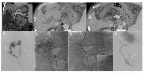 - Entezari, P.; Riaz, A.; Thornburg, B.; Salem, R. Percutaneous Ultrasound-Guided Superior and Inferior Mesenteric Vein Access for Portal Vein Recanalization-Transjugular Intrahepatic Portosystemic Shunt: A Case Series. Cardiovasc. Intervent. Radiol. 2021, 44, 496–499. [Google Scholar] [CrossRef]