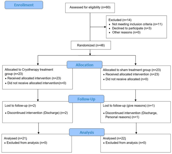 All patients in both groups underwent medial parapatellar arthrotomy with tourniquet use for the TKA. A pretest was performed by physical therapists on all the study participants before starting the experiment. The 46 patients were randomly divided into 23 experimental patients in the cryotherapy treatment group and 23 control patients in the sham treatment group. Three patients (two in the experimental group and one in the control group) dropped out, owing to physical problems, early discharge, and personal reasons. Finally, 21 and 22 patients in the experimental and control groups, respectively, participated in the study. The pre- and post-test assessments included range of motion, pain, edema, and gait. Goniometers (Goniometers, Fabrication Enterprises Inc., White Plains, NY, USA) were used to measure the participants’ range of motion, the visual analog scale (VAS) was used to measure pain levels, a tape measure (Rollfix, Hoechst Mass, Frankfurt, Germany) was used to measure edema, and the 10 m walking test (10 MWT) was used to measure gait. The study was initiated on postoperative day three of the total knee replacement. The experimental group underwent cryotherapy treatment twice for 3 min, once before and after the exercise, and the initial rehabilitation exercise lasted for 30 min, six times a week for two weeks, for a total of 12 sessions by physical therapists. The control group received the sham treatment for 3 min twice, once before and after the exercise. Additionally, the experimental and control groups performed CPM (continuous passive movement) once daily for 30 min, six times a week for two weeks, for a total of 12 sessions (Figure 1).
