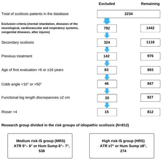 Participants were included in the study based on the following criteria: age; dorsal asymmetry (ATR) ≥ 5° (diagnosed for the first time) or Hump sum ATR ≥ 6°; spinal curvature detected by X-ray with features of idiopathic scoliosis and a Cobb angle ranging from ≥10° to <50°; at least two months of previous scoliosis treatment; and a Risser sign ≤ 4. Figure 1 provides a summary of the exclusion criteria.