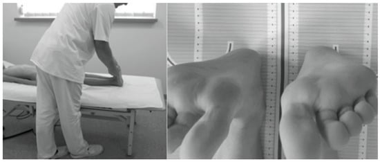 The study protocol involved assessing ATR in the Adams test using a Bunnell scoliometer [44,45] and evaluating the presence of FLLDs according to Cooperstein [49] as modified by Travell et al. [50] and Fryer et al. [51]. The level of the lower surfaces of the heels was assessed with the child lying supine with the lower limbs evenly placed along the trunk, straight at the knee joints, with the ankle joints in intermediate positions between pronation and supination and between dorsiflexion and plantar flexion. The assessment was performed twice to eliminate measurement errors related to uneven adherence of the pelvis to the ground or non-axial positioning of the lower limbs in relation to the torso. In the latter case, the assessment was preceded by a slight pull-up and flexion of the lower hip joints. A heel level difference was diagnosed when the height of each heel differed by ≥0.5 cm (Figure 2) [46].