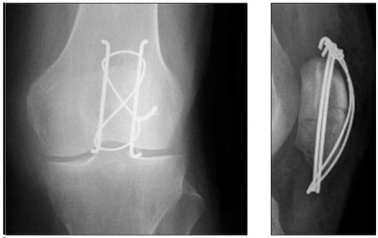- Wild, M.; Khayal, T.; Miersch, D.; Windolf, J.; Hakimi, M. Die Zuggurtungsosteosynthese nach Patellafraktur. Komplikationen und mittelfristige klinische Ergebnisse [Dynamic cerclage wiring of patellar fractures. Complications and midterm functional results]. Unfallchirurg 2008, 111, 892–897. (In German) [Google Scholar] [CrossRef]