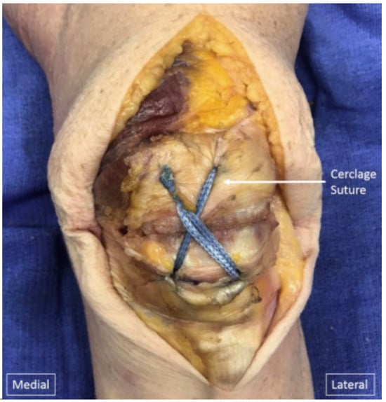 Non-absorbable braided sutures, such as FibreTape (Arthrex, Inc., Naples, FL, USA), in isolation have demonstrated comparable strength to TBW, with limited soft-tissue irritation compared to metalwork [62,63,64] (Figure 3). Braided sutures exhibit lesser creep, greater stiffness, and lesser extensibility than standard sutures but have inferior strength to metalwork [65]. Additionally, the radiolucent properties of sutures allow for a more accurate assessment of the fracture reduction radiographically and both intra- and postoperatively compared to metallic hardware. However, when this technique is employed, additional postoperative immobilization is often recommended [61]. This method of fixation may play a role in simple fracture patterns, but may not be appropriate for more complex fractures, either in isolation or in combination with other methods.