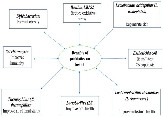 A growing body of research is being done on the use of probiotics, which are defined as “live microorganisms that, when administered in adequate amounts, confer a health benefit to the host” [17]. Probiotics can be utilized for a variety of illnesses depending on their genetic makeup, the number of species comprised in the product, its intended use, and its shelf life. This is because probiotics have diverse nutritional and therapeutic qualities. A probiotic strain’s production, effects, and health advantages for the host determine which strain to use (Figure 1) [1]. Lactobacillus, Escherichia coli, Bifidobacterium, Enterococcus, Saccharomyces, Pediococcus, Lactobacillaceae, Streptococcus, and Leuconostoc strains of probiotics have been utilized in an attempt to obtain defined health benefits. The two most popular microorganisms used as probiotics are Bifidobacterium spp. and lactic acid bacteria (LAB) [18].