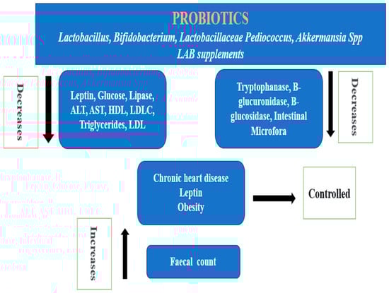 Figure 2 explains the anti-obesity actions of Lactobacillus, Bifidobacterium, Lactobacillaceae Pediococcus, Akkermansia spp., and LAB probiotics supplements. These probiotics work by lowering the low-density lipoprotein (LDL) and total cholesterol level, assisting in the maintenance of a normal weight with low leptin levels, and reducing the incidence of chronic heart disease. While there is a reported increased fecal count, they also lower LDL-C, AST, ALT, HDL, glucose, lipase, and triglycerides. The intestinal microflora, as well as the production of β-glucuronidase, β-glucosidase, and tryptophanase, is likewise decreased by these probiotics [63,66,67,68].