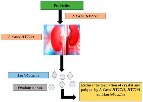 Hypercalciuria and hyperoxaluria are the main risk factors for the development of renal stones, which can seriously harm kidney function. Most of the oxalate formation occurs in the gut. Lactobacilli are administered as supplements in nephrolithiasis [74] and may help prevent stone formation and lower the risk of urolithiasis.