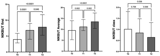 At both T1 and T2, a significant improvement in NIKBUT first (from 4.01 [2.87–5.88] s to 6.89 [4.01–8.98] s [Friedman test; p = 0.0001] and 7.90 [5.28–11.76] s [Friedman test; p < 0.0001], respectively) and NIKBUT average (from 9.63 ± 5.03 s to 11.72 ± 3.84 s [one-way ANOVA; p = 0.002] and 13.85 ± 4.88 s [one-way ANOVA; p < 0.0001], respectively) was found; NIKBUT class showed a significant improvement at T2 (from 1.00 [0.00–2.00] to 1.00 [0.00–1.00] [Friedman test; p = 0.036]) (Figure 1).
