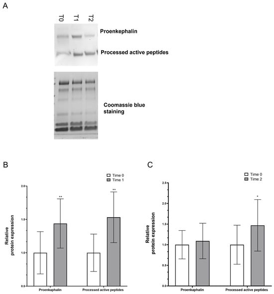(A) Representative immunoblotting of proenkephalins and processed active peptides in tear samples. Coomassie blue staining was used as the loading control (* p < 0.05; ** p < 0.01). (B) Proenkephalin and processed active peptides levels significantly increased at T1 with respect to T0 (p = 0.005 and p < 0.001, respectively). (C) After 60 days (T2), only processed active peptide level remained higher compared to T0 (p = 0.048).