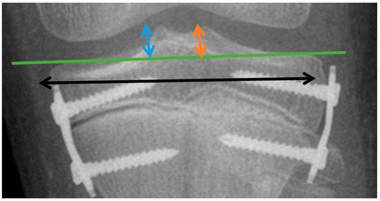 To illustrate changes in the tibial plate surface expressed in millimeters, the changes in the height of the intercondylar tubercles of the medial MLH (dimension measured from the tibial articular line to the highest point in the projection of the medial intercondylar tubercle; blue arrow) (Figure 3) and lateral LTH (dimension measured from the tibial articular line to the highest point in the projection of the lateral intercondylar tubercle; orange arrow) (Figure 3) were assessed. Changes in the width of the distal tibial epiphysis were illustrated by the TW parameter (width of the tibial epiphysis measured between the widest points of the proximal tibial epiphysis, one located on the lateral and the other on the medial cortex; black arrow) (Figure 3).