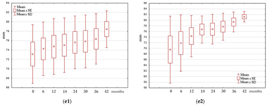 Example of box-and-whisker plots illustrating changes in the investigated parameters over the specific time periods for group III: (a1,a2)—roof angle (D) in the group of girls and boys, respectively; (b1,b2)—slope angle β in the group of girls and boys, respectively; (c1,c2)—lateral tubercle height (LTH) in the group of girls and boys, respectively; (d1,d2)—medial tubercle height (MTH) in the group of girls and boys, respectively; (e1,e2)—tibial width (TW) in the group of girls and boys, respectively.