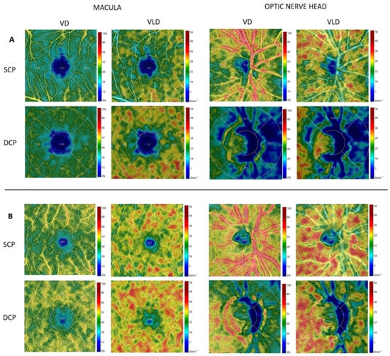 Two ophthalmology specialists, experts in retinal diseases (T.V. and A.L.), performed a detailed review of the OCTA images. VD and VLD were automatically calculated in a fovea-centered circle area (1 mm diameter around the foveola) and in a parafoveal area (an annular area extending between 1 and 2.5 mm diameter, centered on the foveola) segmented into four quadrants (superior, nasal, inferior, and temporal), and then density parameters were recorded for each of them. Furthermore, the mean values of VD and VLD in the foveal area, in the parafoveal area, and in the whole macular area were recorded in SCP and DCP for each patient. Finally, the foveal avascular zone (FAZ) was automatically calculated by the OCT-integrated software for both SCP and DCP.