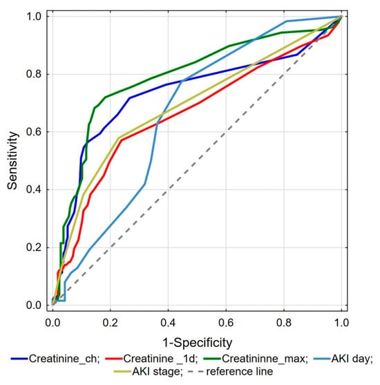 The investigated data overview was presented as means with standard deviations and medians with interquartile ranges (IQRs). Categorical variables are shown as the number of occurrences with percentages. Depending on the distribution condition, checked with the Shapiro–Wilk test, continuous variables were compared using a t-test or Mann–Whitney U test. The chi-squared test was performed to compare categorical data. Univariable and gradual backward multivariable logistic regression analyses were conducted to investigate significant relationships with AKI occurrence. Receiver operating characteristic (ROC) analysis was performed to compare the predictive properties of considered renal function parameters.