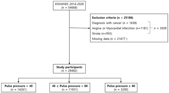 A total of 54,668 individuals initially participated in the study. Participants diagnosed with cancer, angina pectoris, myocardial infarction, or stroke, as well as those younger than 19 years old or with missing information, were excluded, and then 29,482 participants remained. Among them, there were 14,261 participants with a PP less than 40 mmHg, 11,931 with a PP between 40 and 60 mmHg, and 3290 with a PP of 60 mmHg or more (Figure 1).