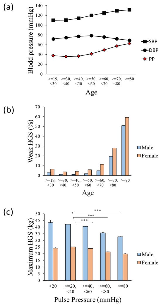 Tendency of blood pressure and prevalence of weak HGS by age, and maximum HGS by PP intervals. (a) Changes in SBP, DBP, and PP according to age. SBP (blue), DBP (orange), PP (gray). (b) Prevalence of weak HGS in males and females among different age groups. Male (blue), female (orange). (c) Average maximum HGS in males and females among different PP intervals. Reference group (20 ≤ PP < 40 mmHg), t-test, *** p < 0.001, male (blue), female (orange). DBP: diastolic blood pressure; HGS: handgrip strength: PP, pulse pressure; SBP: systolic blood pressure.