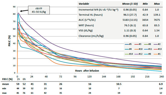 According to expert recommendations [14,16], a PK assessment was carried out by infusing 45–50 IU/Kg of rIX-FP in less than 10 min, in non-bleeding state, after at least a 4-d wash-out. Blood samples for FIX coagulant activity (FIX:C), measured with a one-stage coagulation assay (HemosIL SynthASil, Instrumentation Laboratory/Werfen, Bedford, MA, USA), were collected at baseline and 1 and 6 h after the end of the infusion and up to 10 days thereafter, usually at 24, 48, 72, 120, 168, and 240 h. At baseline, the anti-FIX inhibitor was tested by the Bethesda method with Nijmegen modification using the above-mentioned FIX:C assay. For PK analyses, the non-compartmental model was evaluated using the Phoenix WinNonlin software package, version 8.3 (Pharsight Corp., Mountain View, CA, USA). The terminal half-life (HL), area under the curve from the time of infusion to the last measurement (AUC), clearance (normalized by body weight), volume of distribution at steady state (VSS), and mean residence time (MRT) were calculated. Incremental in vivo recovery (IVR) was obtained by dividing the maximum observed FIX:C level and the infused dose.